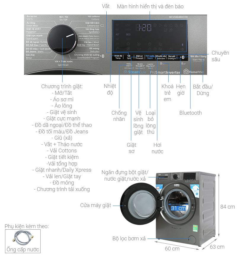 Máy giặt Beko Inverter 10 kg WCV10648XSTM sở hữu thiết kế màu xám vô cùng sang trọng, tinh tế, kết hợp cùng bảng điều song ngữ Anh - Việt, có núm xoay và màn hình hiển thị giúp tôn lên vẻ đẹp hiện đại, phù hợp với nhiều không gian khác nhau.